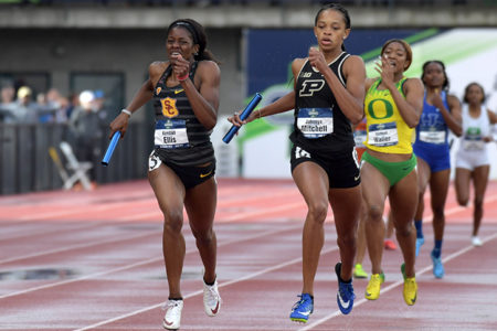 The NCAA does mandate that relay teams wear the same uniforms during a race, but other than that, all bets are off. Hey, I don’t want to see the boys from Indy go nutso on regulations like the HS Federation and penalize people for non-matching underwear or wearing a necklace, but how about at least an official-colors rule? And while you’re at it, how about a regulation that all teammates in the same race have to wear the same uniforms?
