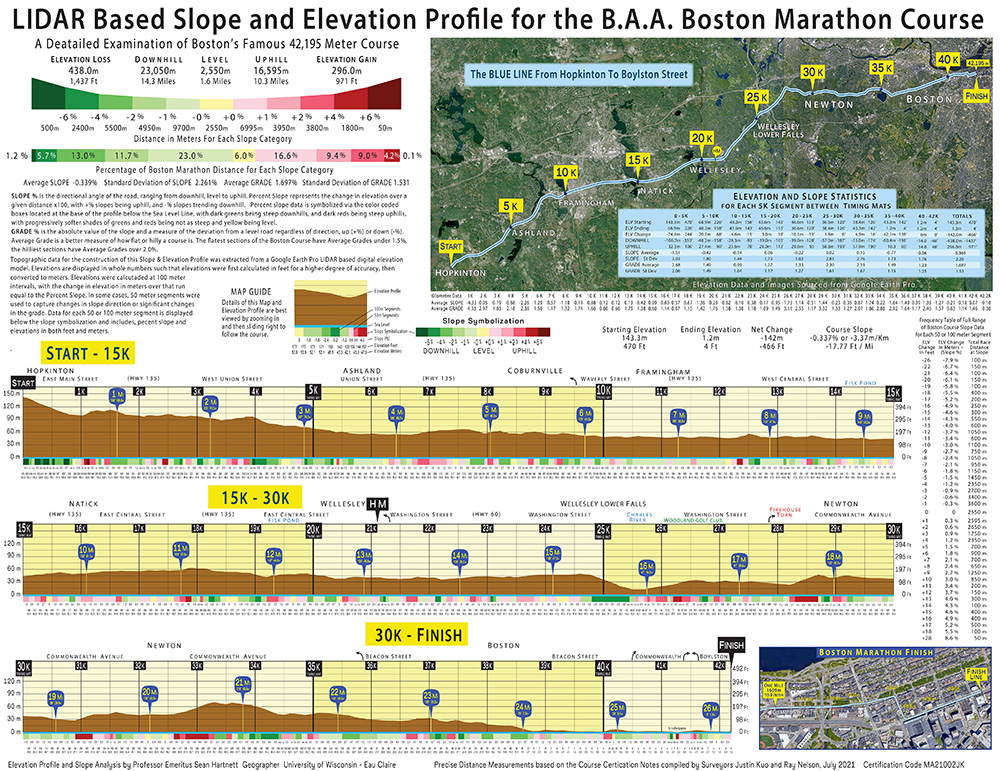 A week before the annual Patriot’s Day running of the B.A.A. Boston Marathon, retired UW-Eau Claire Geography Professor Sean Hartnett has produced a new generation of elevation and slope profiles of the famously hilly 42.195 kilometer, or 26.2-mile course.