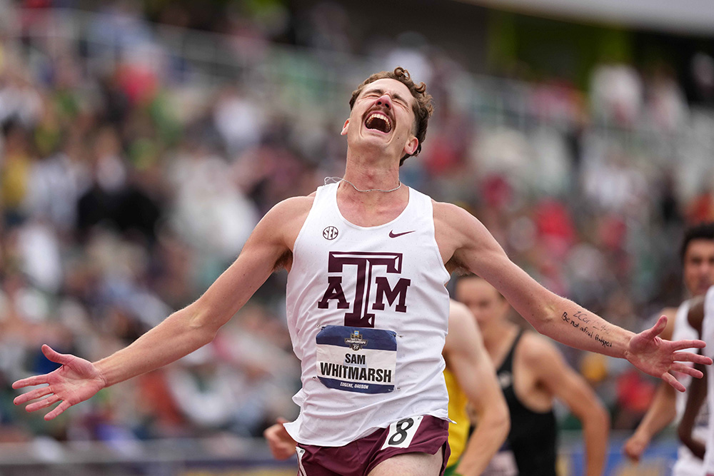 It was the 2021–22 season, his first at Texas A&M, and the setbacks Whitmarsh endured set him on the path leading to the NCAA 800 title his senior year. The Lake Jackson, Texas, native had two heart surgeries to fix a previously undiagnosed condition, reinvested in his faith and realized “maybe don’t walk around in Aggie gear in downtown Austin.” (Don’t worry — It was a rubber bullet and he was OK, but we’re getting ahead of the story.)