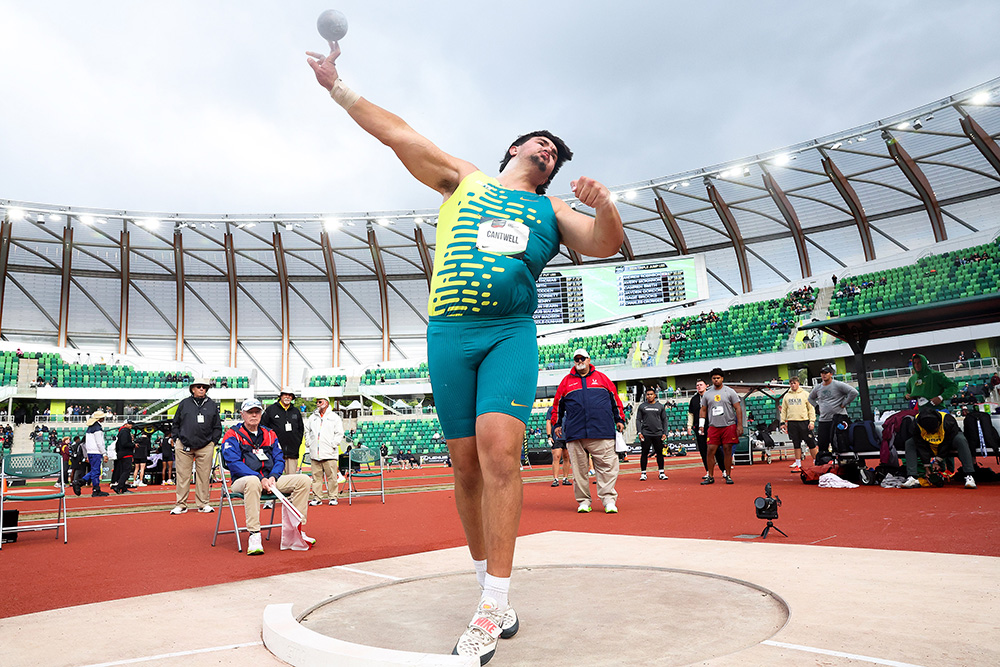 Thomas opened at 68-7¾ (20.92) before Cantwell, throwing next in the order, lofted one out to 69-2½ (21.09) to take the lead for good. Cantwell launched his longest in round 5.