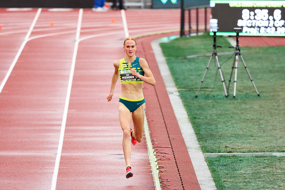 EUGENE, OREGON, June 19–22 — Four hours after Cooper Lutkenhaus’s 2-lap heroics on the boys side of the Nike High School Nationals, in better but still rainy conditions, Jane Hedengren (Timpview, Provo, Utah) embarked on another of her reality-altering solo efforts, this time at 3000m. “I try to come in to a race not over-analyzing it, but I knew today was going to be a real grind,” she said.