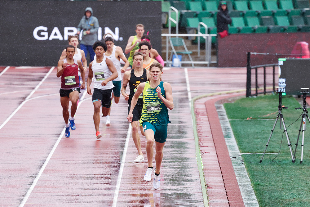 Running in a cold rainstorm here, Lutkenhaus passed the 400 in 52.20, a few meters back of the quick 51.70 pace set by Bryson Nielsen (Eastmark, Mesa, Arizona). Just past the 500, the Texan took off, chasing the wavelights that were set for 1:46. It was no contest.