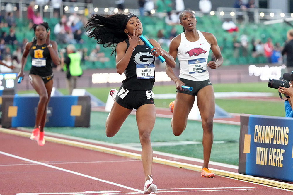 Effiong’s 49.17 brought the Razorbacks in at 3:24.25, but Butler’s 48.79 took the Dawgs through with a collegiate-leading 3:23.62 — their first-ever NCAA win in this event,. The time strengthened Georgia’s hold as the No. 8 school all-time.