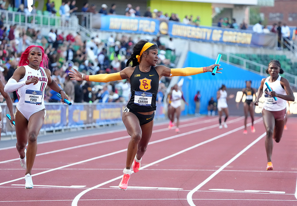 The Trojans — with exchanges that any national team would envy — finished in a collegiate-leading 42.22, slightly improving their hold on No. 4 school all-time, while the Gamecocks’ 42.40 elevated them from No. 10 to No. 8. Jasmine Montgomery brought A&M home in 3rd at 42.89.