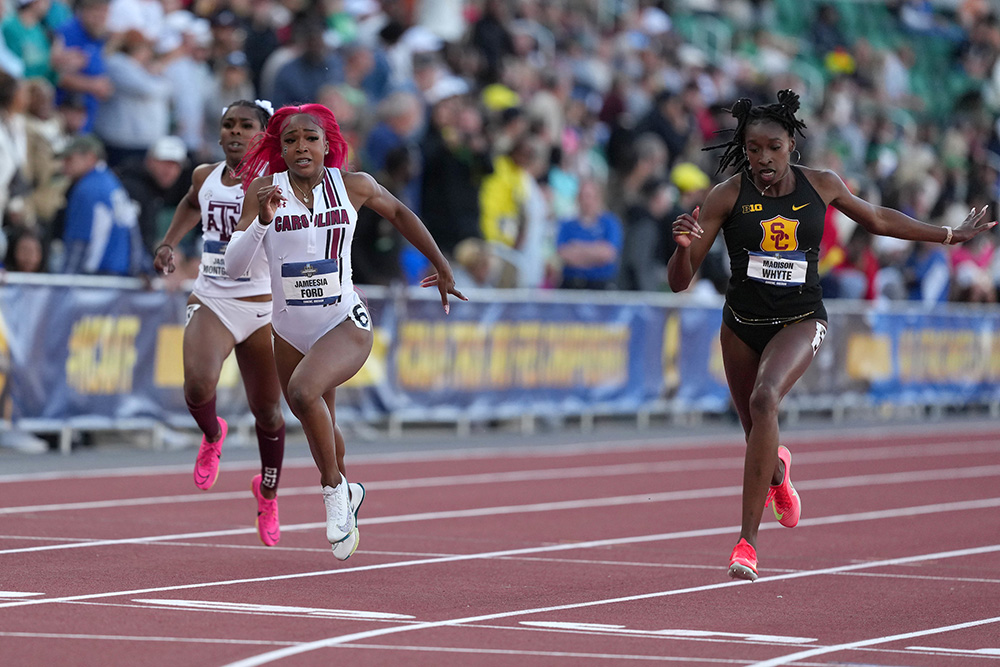 In this final, Ford was in lane 6, with Jasmine Montgomery to her outside and Whyte to her inside. Montgomery got out well, but Ford closed the stagger by the top of the straight. However, Whyte’s curve was even better and she pulled nearly even with the Gamecock. Ford dug deep and held her off, never allowing the Trojan to overtake her.